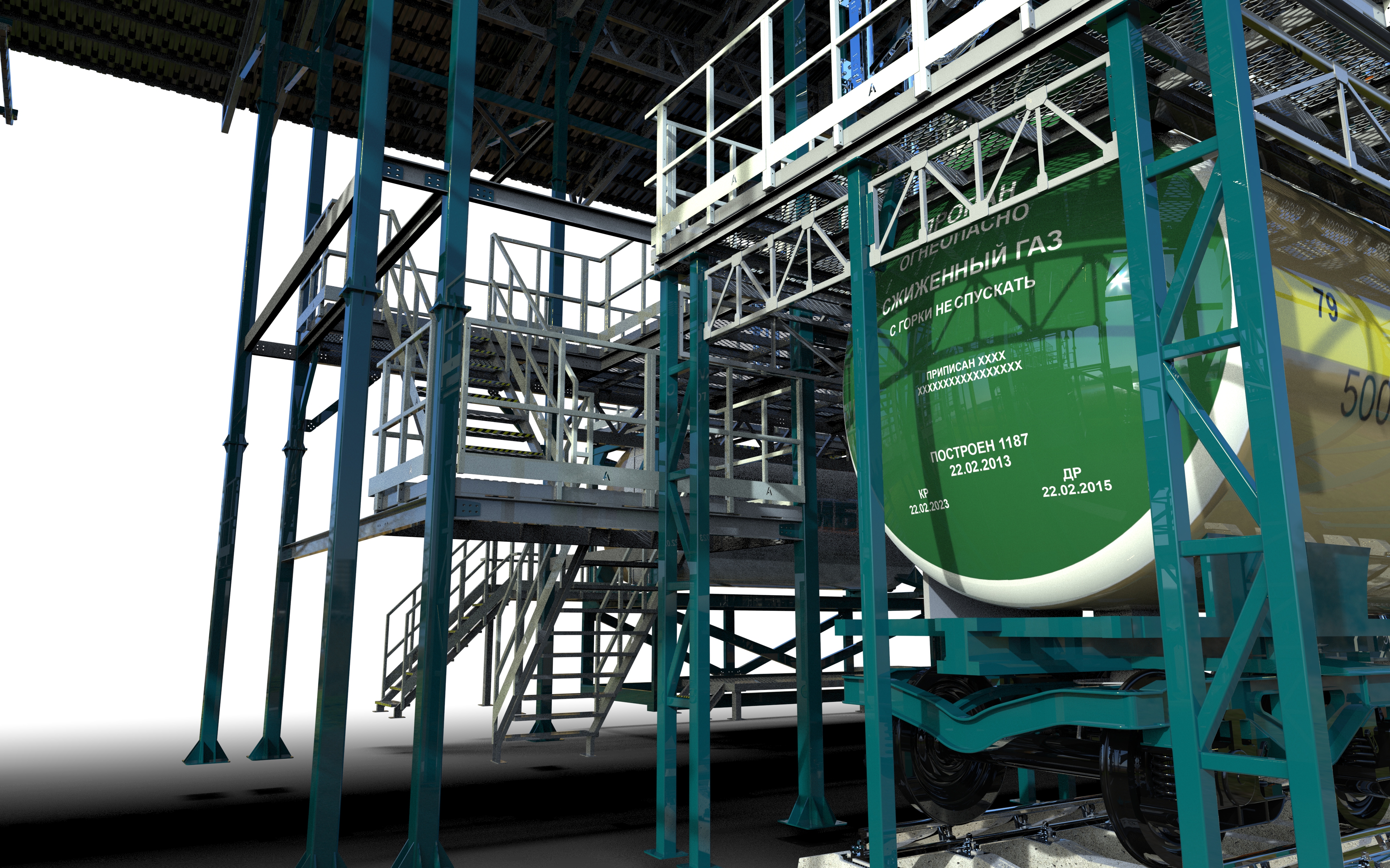 Железнодорожная цистерна: разделена на две секции — для ЛВЖ и СУГ, с комплектом технологических люков и поручней.